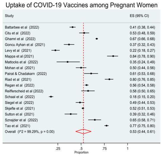 The acceptance rate of vaccination against COVID-19 among pregnant women ranged from 17.6% to 84.5%. The pooled proportion of vaccination uptake against COVID-19 in the pregnant population was 0.53 (95% CI: 0.44–0.61). The results of our study are similar to the results of two earlier meta-analyses [33,34] and found that the global prevalence of pregnant women receiving the vaccine for COVID-19 was approximately 49–54%. However, in a meta-analysis investigating the pooled proportion of women who had been vaccinated against COVID-19, it was 29% [35].