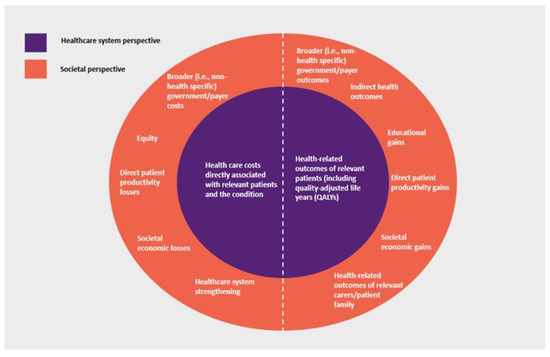 A key methodological consideration of HTA is defining the evaluation ‘perspective’, i.e., the scope of costs and outcomes considered. While there may be practical variations, HTA generally takes one of two approaches, reflecting where costs and outcomes occur and whether they are directly or indirectly attributable to the condition and medical intervention being considered. The narrower ‘healthcare system perspective’ generally includes health care costs (including those incurred by the patient) and health-related outcomes directly attributable to the treatment, disease and patient being considered. In many countries, this perspective reflects the government role as ‘payer’ for health care (i.e., a ‘payer perspective’). In addition to these, the broader ‘societal perspective’ may also consider additional costs and outcomes that impact patients, family and carers of patients, governments and payers, and society overall, with potentially various elements of value being able to be considered [26] (Figure 1).