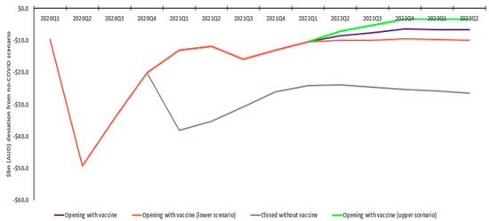 The estimated lockdown-related reduction in economic activity sees a sharp drop in Commonwealth Government revenues, while simultaneously seeing greater expenditures supporting pandemic response, the economy and society. The with vaccination scenario sees an estimated net positive AUD 258.6bn change in finances (i.e., revenues less expenditures) (Table 2). This illustrates improved taxation revenues and reduced expenditures due to improved health outcomes and economic activity. This table was populated using data from simulation of the VURM. The model-determined output was produced, in the main, from user-determined input. The input includes detailed information on Commonwealth and state and territory government COVID support payments and other related expenditure through schemes such as JobKeeper. More detail of support measures included is given in www.treasury.gov.au/coronavirus (accessed on 10 October 2022) [38]. For further details of the results of modelling, refer to Appendix B.