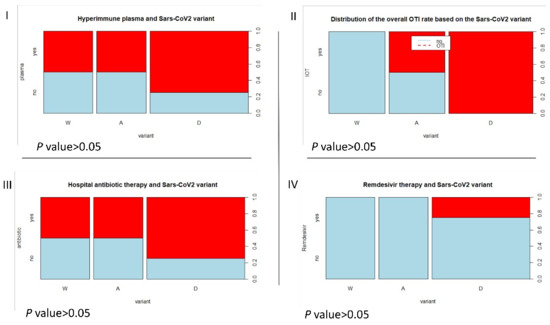 (I) The different therapy performed (in red) during the step-up stay of severe-critical COVID-19 pregnant women based on the variant (W = wild, A = alpha, D = delta). Half of W and A underwent hyperimmune plasma and antibiotic therapy, whereas in D the percentage rose to 75%. (II) None of the W patients underwent OTI, whereas half of the A and all the D patients needed it. (III) the different therapy performed (in red) during the step-up stay of COVID-19 affected pregnant women based on the variant (W = wild, A = alpha, D = delta). (IV) None of the W and A patients underwent remdesivir, whereas 33% of D needed it. The graphs represent a descriptive comparison of the variables’ proportions.