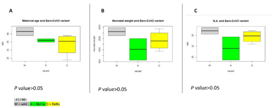 From left to right (A–C), the different characteristics of severe-critical COVID-19 affected pregnant women based on the variant (W = wild in grey, A = alpha in green, D = delta in yellow). From left to right: the maternal age, the gestational age (g.a.) and the neonatal weight. The median maternal age and the median gestational age (g.a.) were higher in the wild group, respectively 41.5 [2.5] yrs and 37.1 [1.5] wks, ds. Notably, the A group was characterized by the lowest median g.a., in detail 28.9 [5.35] wks, ds, and the lowest neonatal weight, 1145 [955] g. See Table 2.