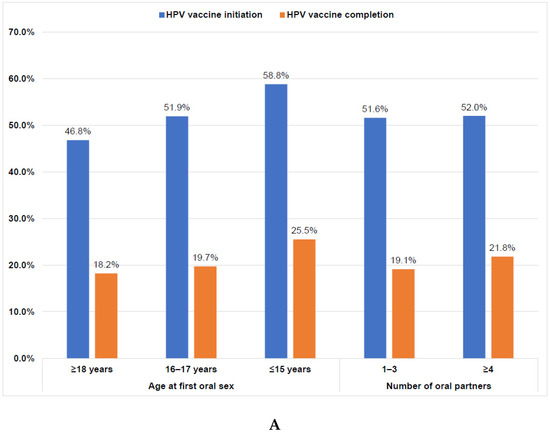 Overall, 45.5% had initiated the HPV vaccine, and 16.5% had completed the vaccination series (Figure 1). Initiation was higher among students who had ever engaged in sexual activity (47.6%) than those who were sexually naïve (35.3%; p = 0.0048); however, completion rates were similar (Figure 1). Among students who had ever engaged in sexual activity, those who had their oral sexual debut at ≤15 years had the highest initiation rate (58.8%) while those who had oral sexual debut at ≥18 years had the lowest initiation rate (46.8%; p = 0.0739). Completion rates were similar by age of oral sexual debut (Figure 2A). Initiation and completion rates were also similar for students with 1–3 or ≥4 oral sexual partners (Figure 2A). Students who had vaginal sexual debut at ≤15 years had the highest initiation rate (57.6%) and completion rates (30.9%), while those who had vaginal sexual debut at ≥18 years had the lowest rates (46.5% and 15.2%, respectively; p = 0.0011; Figure 2B). Initiation rates were similar for students with 1–3 or ≥4 vaginal sexual partners, but completion rates were higher for those with ≥4 vaginal sexual partners (24.4%) than those with 1–3 partners (15.7%; p = 0.0078; Figure 2B).