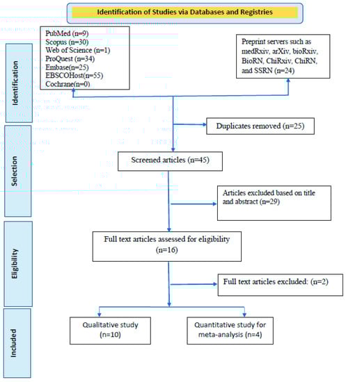A rigorous search of six databases and preprint servers yielded around 178 articles, of which 25 duplicates were identified. During the preliminary screening, these duplicate papers were eliminated. The remaining 153 articles were filtered by title and abstract, and 108 were removed accordingly. Based on eligibility, 45 articles were left for the entire document screening. Twenty-nine articles were excluded because they did not meet the inclusion criteria. After all, studies were selected; 16 were chosen for qualitative synthesis, and four for quantitative synthesis (meta-analyses). For the meta-analysis, one of the studies was split into two articles based on their difference in exposure patterns. Finally, a total of five documents were quantitatively evaluated [11,12,13,14].