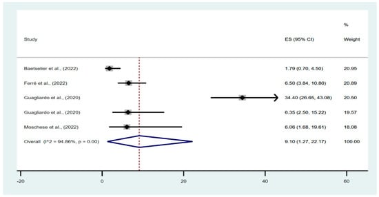 In the meta-analysis of the prevalence of possible asymptomatic cases in the studied populations, 645 individuals were evaluated, of which 66 had asymptomatic infections. The pooled percentage of asymptomatic infections in the investigated population was 9.10% (95% confidence interval [CI], 1.27–22.17%), with a high degree of heterogeneity between studies (I2 = 94.86%; p < 0.01) (Figure 2).
