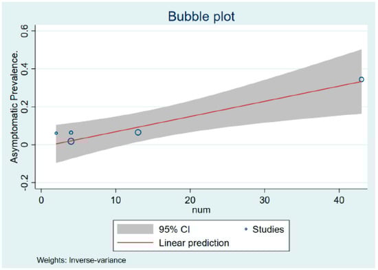 The findings of the quality assessment of the included studies are shown in the Supplement File (Supplementary Materials Annexure S2). A funnel plot was not conducted due to the smaller number of studies included in the meta-analysis. However, we explicitly examine publication bias using Egger’s test for a regression intercept, which gave a p-value of 0.99, indicating no evidence of publication bias. Figure 3 shows the bubble plot showing the liner prediction based on the percentage of asymptomatic MPXV cases with its 95% confidence interval.