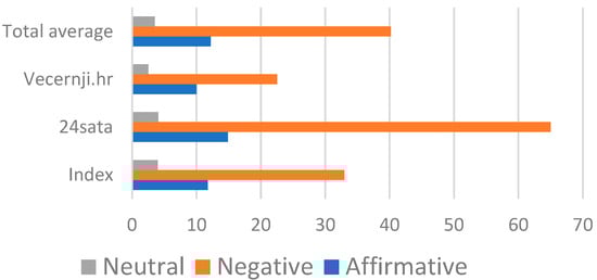 The study employed a two-stage sample design. In the first stage, we used a judgment sample by selecting three online news sites with publicly available user comments-Index.hr, 24 sata.hr and Vecernji.hr-which are among the top five most visited online newspapers in Croatia judged by the average daily real users, either according to the Gemius rating of Croatian web domains [] or according to the Alexa rating []. Both 24 sata.hr and Vecernji.hr represent online versions of the national daily journals, while Index.hr is an online-only media outlet. All three newspapers publish in Croatian. In the second stage, we chose 100 articles published by each portal by using random sampling, thus obtaining the total sample size of 300. The keywords used in finding the suitable articles were (English translation): “COVID-19”, “coronavirus”, “SARS-CoV2”; “scientists”, “scientific research” and various combinations of these keywords. Following the initial sample selection, the screening was conducted in order to include only those reports which entailed sufficient coverage of COVID-19 vaccination issues. The time period in which the analyzed articles were published was from 1 February 2020 to 15 January 2022, while the data were collected during February and March 2022. The study approval was obtained from the Ethics Committee of Faculty of Humanities and Social Sciences, Josip Juraj Strossmayer University of Osijek (approval number: 2158-83-02-19-2). The data are available as a supplementary file to this paper (Supplementary Materials, Supplementary File).