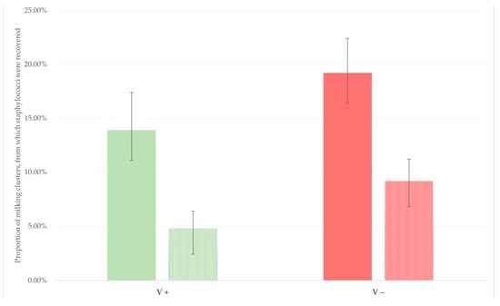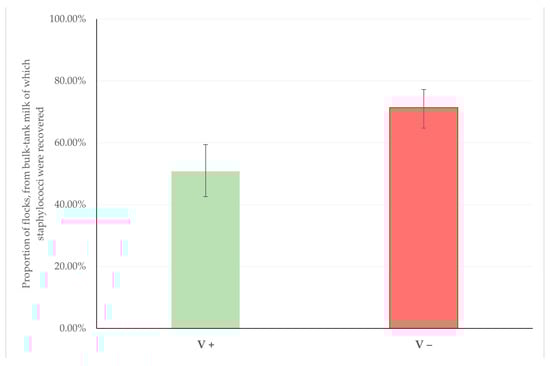 Figure 1. Proportion of flocks in which vaccination against staphylococcal mastitis was (V+) or was not (V−) applied, from the bulk-tank milk of which staphylococci were recovered (modified from Lianou et al. []) (bars indicate 95% confidence intervals).