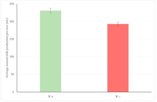 Figure 2. Average annual milk production per ewe among flocks in which vaccination against staphylococcal mastitis was (V+) or was not (V−) applied (modified from Lianou et al. []) (bars indicate standard error of the mean).