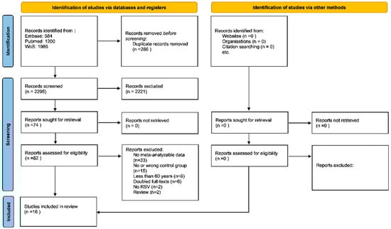 As shown in Figure 1, among 2295 records initially screened, 74 were retrieved as full texts. After excluding some works, mainly because data were not meta-analyzable (Table S1 reports the references and the reason of the exclusion), 16 papers were finally included [,,,,,,,,,,,,,,,].