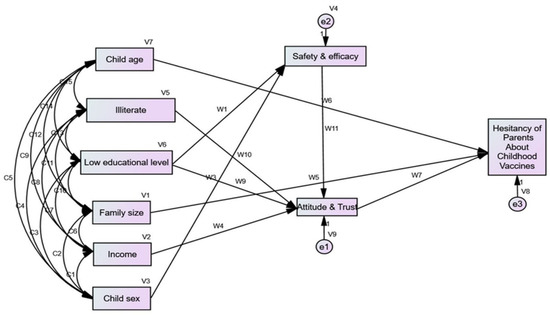 Many studies have reported high rates of VH in the region toward either the initial series of vaccination [23,24,25,26] or the booster dose [27,28]. However, there is scarcity in the literature regarding the parent’s attitude concerning children’s vaccination, especially among parents of children with chronic diseases. This study investigated the extent of COVID-19 VH and its predictors among parents of children with CLD in Egypt. Overall, 81.5% of parents were hesitant about vaccinating their children. Child age, family size, attitude, and trust in vaccination had direct effects on VH, while income, level of parents’ education, and safety and efficacy of vaccines were indirectly effective.