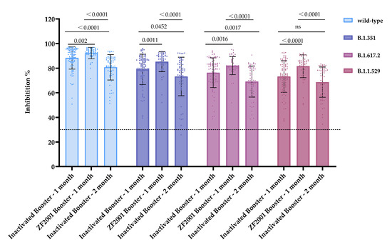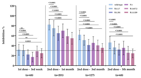 Antibodies induced by the primary inactivated vaccine exhibited inhibitory activity against wild-type, B.1.1.7, B.1.351, P.1, B.1.617.2 and B.1.1.529. Detection time points: 3rd week after the first dose (n = 68), 1st month (n = 201), 3rd month (n = 127), and 5th month (n = 68) after the second dose of inactivated vaccine. The dotted lines represent the cutoff at 30% inhibition. ns: no significance.