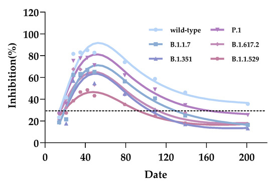 We evaluated and compared antibodies’ ability to inhibit the binding of hACE2 with SARS-CoV-2 strains RBD (wild-type, B.1.1.7, B.1.351, P.1, B.1.617.2, and B.1.1.529) following the reception of inactivated vaccines. We found that antibodies induced by the CoronaVac vaccine with the two primary doses inhibited the binding of hACE2 with SARS-CoV-2 strains. Protection from the first dose up until administration of the second dose was limited [31]. We analyzed the kinetic trend of the antibodies. The inhibitory abilities of serum antibodies against all the targeted strains sharply increased following the second dose and reached their peak within 3 weeks [3]. These trends suggested an extensive range of serum inhibitory activities 3–12 weeks following the second dose of CoronaVac. This range was in accordance with the inhibitory immunity of polyclonal antibodies induced by the BNT162b2 and mRNA-1273 vaccines [32,33,34]. The inhibitory abilities of the antibodies waned six months after the second injection [29]. The antibodies’ inhibition trends were consistent with the serum antibodies of naturally infected patients [25] until the average inhibition rates of the antibodies turned negative.