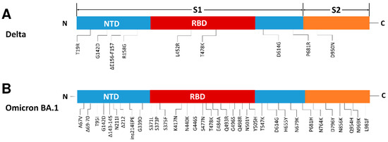 Schematic of severe acute respiratory syndrome coronavirus 2 (SARS-CoV-2) spike protein structure showing the mutations of the variants used in this study (https://outbreak.info (accessed on 10 August 2022)). The N-terminal domain (NTD) is shown in blue and red denotes the receptor-binding domain (RBD). (A) Linear mutation diagram of Delta spike (S1 and S2) proteins. (B) Linear mutation diagram of Omicron spike proteins. Mutations shared by Delta with Omicron are shown in red. Different mutations of Omicron and Delta at the same site are shown in blue.