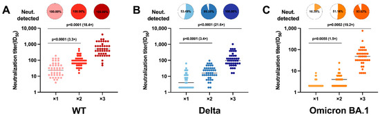 Live virus neutralization test results from 129 serum samples obtained from 43 volunteers vaccinated with three doses of CoronaVac homologously after each dose of CoronaVac. Neutralization of authentic viruses was performed using a cytopathic effect (CPE)-based assay with a viral titer of 1010 TCID50 (median tissue culture infectious dose). The neutralization titer of the serum sample was calculated as the reciprocal of the highest dilution that protected more than 50% of cells from CPE. Pie charts show the proportion of vaccinees within each group that had detectable neutralization against the severe acute respiratory syndrome coronavirus 2 (SARS-CoV-2) live virus. Fold-increase in the geometric mean neutralization titer of each dose relative to those vaccinated with one dose within a group is shown as a number with the “×” symbol above the lines. (A-C) The results of neutralizing antibodies against the wild-type (WT) (A), Delta (B), and Omicron BA.1 (C) viruses in the serum indicated by dots.