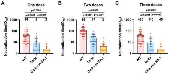 (A–C) The results of cross-neutralization of wild-type (WT), Delta, and Omicron BA.1 viruses by sera from each individual vaccinated with one (A), two (B), and three (C) doses of CoronaVac are shown as bar graphs. The numbers on the graph represent the geometric mean titers (GMT).