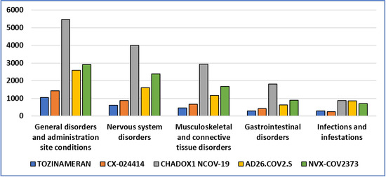 Relative frequency of Individual Case Safety Reports (ICSRs) on TOZINAMERAN, CX-024414, CHADOX1 NCOV-19, AD26.COV2.S, and NVX-COV2373 in EudraVigilance European Database for Suspected Adverse Drug Reaction Reports (EDSADRR) on five predominantly common medical condition groups, with data normalization using the total number of administered doses (number of ICSRs per 1 million administered doses) (data on 17 September 2022, created by the authors based on statistical data [42,43]).