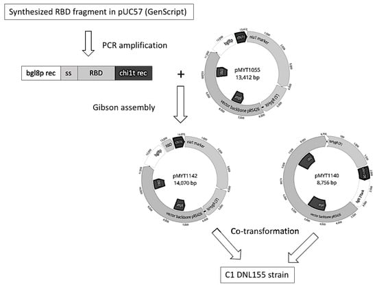 Flow chart of RBD expression plasmid pMYT1142 construction. Plasmid numbers and size as base pairs (bp) indicated. Abbreviations: bgl8p, promoter; ss, signal sequence; RBD, Receptor Binding Domain encoding amino acids 333-527 of the Spike protein from SARS-CoV-2; chi1t, terminator; bgl8p rec, 40 bp recombination sequence to bgl8p; chi1t rec, 40 bp recombination sequence to chi1t; HygR, hygromycin marker; URA3, auxotrophic marker; ampR, ampicillin marker; chi1t DR; direct repeat fragment of chi1t.