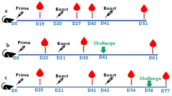 General observations for morbidity and weight loss of challenged animals were carried out for three weeks post-challenge, and the final blood serum was harvested from all surviving mice. At days 20, 35, 61 (Figure 2b), and days 20, 41, 54, 77 (Figure 2c) mouse peripheral blood was harvested, and sera were evaluated by ELISA for anti-RBD-C-tag antibody titers, and virus plaque reduction neutralization titer (PRNT) was measured to determine neutralizing antibody titers.