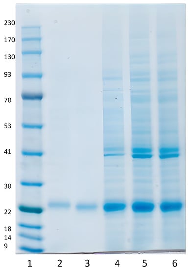 3.2. Integrity and Purity of RBD-C-Tag Subunit Recombinant Antigen Vaccine Harvested at 90-h EFT, as Monitored by Protein SDS-PAGE