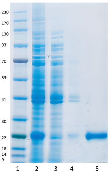 S1333–527RBD-C-tag vaccine antigen purification by affinity chromatography on a CaptureSelectTM C-tag affinity matrix (Thermo Fisher Scientific, Carlsbad, CA, USA). The representative gel shows SDS-PAGE with Coomassie Blue dye staining of proteins. Lane 1, MW protein markers; lane 2, EFT 90 h. fermentation supernatant, lane 3, fluid flow through; lane 4, wash fraction, lane 5 2.5 µg of purified eluted RBD C-tag antigen. The purified S1333–527RBD-C-tag vaccine antigen is marked with an arrow on the right.