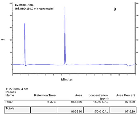 Assessment of purity of C1-cell manufactured RBD-C-tag, as determined by reverse phase HPLC-reverse phase chromatography. The purity of the two different RBD sample runs were 97.16% for the sample with 75 μg RBD (A) and 97.63% for the sample with 150 μg RBD (B). part per million (ppm), Calculated (CAL), millivolts (mv).