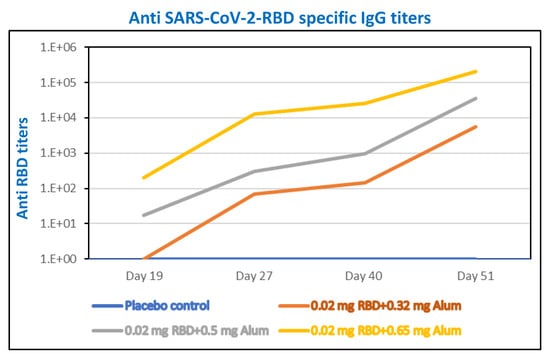 By contrast, immune sera obtained from mice that were injected with 500 μg (25:1 Vaccine) or 620 μg (32:1 Vaccine) Alhydrogel®‘85’ adjuvanted RBD-C-tag showed elevated IgG responses, as measured by the anti-RBD ELISA (Figure 7). p values were determined by two-way Analysis of Variance (ANOVA). The p values of placebo or 16:1 vaccine groups versus 25:1 vaccine or 32:1 vaccine groups were p < 0.013, while the p value between 25:1 vaccine and 32:1 vaccine was p = 0.49. DYAI-100A85 vaccine-immunized mice sera obtained on day-27 and on day-40, (corresponding to six and twenty days after the second dose of the 1:16 vaccine, respectively) consistently showed high RBD specific IgG titers. The p value of placebo versus 16:1 vaccine group was p < 0.013. Comparison of the 16:1 vaccine group to 25:1 and 32:1 vaccine groups gave p values of p = 0.336 and p = 0.242 for day-27 sera and p = 0.69 and p = 0.0061 for day-40 sera, respectively (Figure 7). The sera obtained at day-51, 10 days after the third vaccination gave very high titers of specific anti- RBD IgG, with Geo-Mean titers of 5572; 36,204; and 54,874 for the 16:1, 25:1 and 32:1 vaccine groups, respectively. At that stage, there was no significant difference between 25:1 and 32:1 formulated vaccines with a p value of 0.18, but there was a marked difference between 25:1 and 32:1 formulated vaccines to the 16:1 vaccine group with p values of 0.008 and 0.0071, respectively (Figure 7).