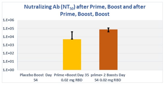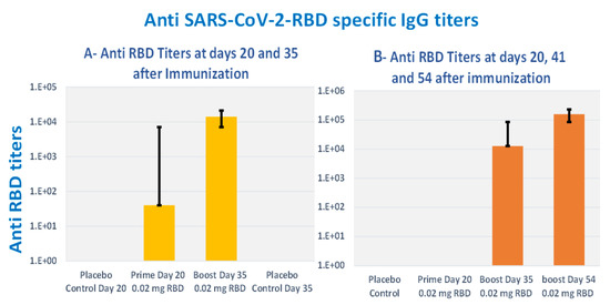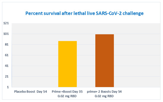 To determine the immune-protective efficacies of Alhydrogel®‘85’ adjuvanted RBD-C-tag vaccine, we used K18-hACE2 C57BL/6J transgenic mice as the animal model of disease and mortality for SARS-CoV-2-induced Acute Respiratory Distress Syndrome (ARDS) [61,62,63]. Two groups of K18-hACE2 C57BL/6J mice were immunized. The first experimental group of mice was immunized subcutaneously on days 0 and 21 with a total of two injections, each injection containing 20 μg RBD-C-tag adjuvanted with 640 μg Alhydrogel®‘85’) adjuvant:antigen ratio of 32:1). These mice were challenged on day 41, 20-days after the first Boost (2nd injection total), by intranasal inoculation of mice with 2000 PFU (Plaque Forming Units) of lethal live SARS-CoV-2 virus. The second experimental group of mice was immunized subcutaneously on days 0, 21, 42 with a total of three injections, each injection containing 20 μg RBD-C-tag adjuvanted with 640 μg Alhydrogel‘85’®. These mice were challenged 14 days after the third injection (corresponding to the 2nd booster), by intranasal challenge with 2,000 PFU of lethal live SARS-CoV-2 virus. The control mice groups were injected with 640 μg of Alhydrogel®‘85’ adjuvant alone as a “negative control” without vaccine RBD antigen. Peripheral blood sera were collected on days 20 and 35, for the first (A), group and on days 20, 41 and 54, for the second (B), group to evaluate efficacy, as monitored by ELISA for RBD-C-tag-specific binding antibodies (Figure 8), and by PRNT (plaque reduction neutralization titer) assays for neutralizing antibodies against VSV-SARS-CoV-2-S1 pseudo-type virus (Figure 9). In sera obtained from mice of the 1st group, 14-days post-second immunization, the reciprocal titers of SARS-CoV-2 RBD-specific IgG ranged from 3200 to 102,400 with a geometric mean titer (GMT, Geo-Mean, reciprocal) of 16,600. (Figure 8A) p values were determined by two-way Analysis of Variance (ANOVA). The p value of reciprocal-titers determined for the sera obtained on day 20 versus titers of 14 days post boost was p = 0.013. The determined PRNT50 values ranged to 32,000 with a GMT of 5233 (Figure 9). The prime-boost immunization regime protects 87.5% of mice, due to a single mouse that did not develop a sufficient immune response (Figure 10). In sera obtained from mice of the second group, 20-days post-second immunization, the reciprocal titers of SARS-CoV-2 RBD-specific IgG ranged from 3200 to 102,400 and the sera obtained at day 54, 14 days after the third vaccination elicited very high titers of specific anti-RBD IgG, that ranged from 25,600 to 409,600 with geo-mean titers of 157,922 (Figure 8B). The third immunization elicited very high levels of antiviral neutralizing antibodies in all mice, with PRNT50 values in the range of 22,627–512,000 with a GMT of 76,108 (Figure 9). The p value of reciprocal-titers determined for the sera obtained on day 41, versus titers at 14-days post the 2nd boost was determined as p = 0.0014. The prime boost, boost immunization regime protected 100% of mice from the challenge with lethal live virus (Figure 10). Moreover, there was no difference in the mean body weight of mice observed in all study groups, thus indicating that the C1-produced RBD-C-tag antigen-treated and control adjuvant only-treated mice did not develop any adverse effects toxic effects at the doses investigated.