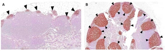 (A) The iliac lymph node from an animal injected with the Alhydrogel®‘85’, Placebo (Group 1, control item), sacrificed 42 days post first dosing (Recovery phase). Note, arrowheads-no evidence of germinal centers (normal appearance compared with figure b). Staining with antibody for PAX-5 (Biocare’s PAX clone BC/24); and (B) the iliac lymph node from an animal injected with C1-RBD Vaccine (Group 2, test item), sacrificed 42 days post first dosing (Recovery phase). The lesions (arrowhead) consist of mild germinal centers increased lymphocytic cellularity (i.e., follicular hyperplasia). Compare with (A).