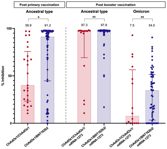 Neutralising antibody against the wild type (four weeks after primary vaccination and booster dose) and Omicron strain (four weeks after booster dose) in LT recipients. Values above bar graphs represent the median of % inhibition (*, statistically significant; NS, non-statistically significant).