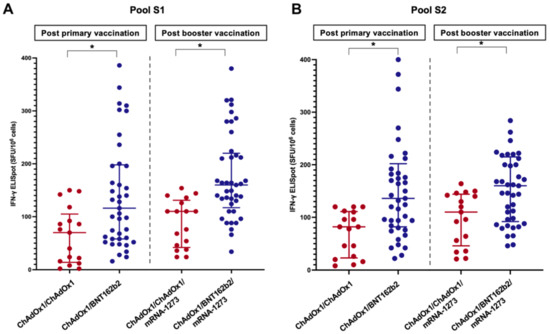 The T-cell response was evaluated in 58 randomly selected LT patients: 41 in the ChAdOx1/BNT162b2 group and 17 in the ChAdOx1/ChAdOx1 group. The baseline clinical and laboratory characteristics were comparable between the two groups (p > 0.05) (Table S1). The results of the IFN-γ ELISpot assay using pools S1 and S2 are shown in Figure 4. The spike-specific cellular response followed a trend similar to that of the humoral response. The percentages of positive responses after primary vaccination and booster were 51.2% and 80.5% in the ChAdOx1/BNT162b2 group and 23.5% and 52.9% in the ChAdOx1/ChAdOx1 groups, respectively. The median SFU/106 PBMC cells of LT patients receiving the heterologous primary vaccine protocol was significantly higher than those receiving the homologous protocol (Table 2 and Figure 4). A significant correlation was observed between the anti-RBD titre (r = 0.32, p = 0.02) or sVNT (r = 0.30, p = 0.03) and spike-specific T-cell responses.