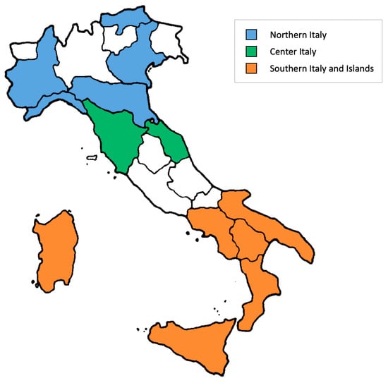 The total number of sera to be collected was calculated taking into account that the study has been designed to evaluate the sero-prevalence against a number of vaccine-preventable infectious diseases. The sampling protocol for each regional center was in accordance with the estimates made during the seroepidemiological studies conducted within the European ESEN (European Sero-Epidemiological Network) project [12,13,14,15,16], in which samples were taken for the national seroprevalence studies conducted in 1996, 2003–2004 and 2013–2014. Nowadays, available samples have been collected (period June 2019–May 2020) from 13 regional centers, (Northern Italy: Autonomous Province of Bolzano, Emilia-Romagna, Liguria, Piedmont and Veneto; Central Italy: Tuscany, Marche; Southern Italy and Islands: Basilicata, Calabria, Campania, Apulia, Sardinia, Sicily) (Figure 1).