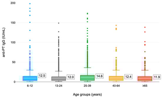 Distribution of anti-PTx IgG titers in different age groups (the mean concentration is shown in the box).