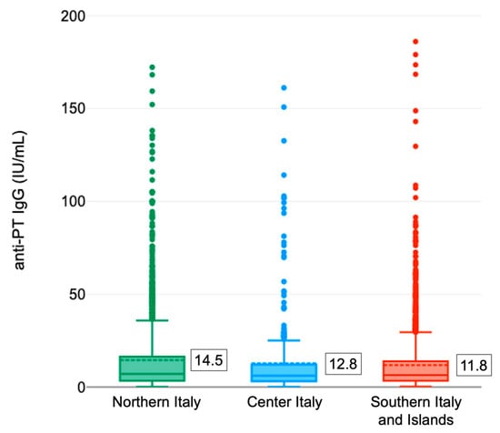 Distribution of anti-PTx IgG titers in different Italian areas (the mean concentration is shown in the box). Legenda: Northern Italy: Bolzano, Emilia Romagna, Liguria, Piedmont and Veneto; Center Italy: Marche and Tuscany; Southern Italy and Islands: Basilicata, Calabria, Campania, Apulia, Sardinia and Sicily.