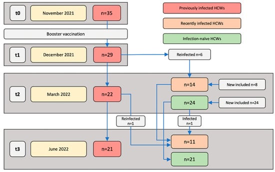 The HCW study cohort has been previously described with results up to June 2021 [9]. In this study, 35 previously infected HCWs continued to participate in this follow-up study from November 2021 (Figure 1). Of these participants, thirteen, ten, nine, and four had received BNT162b2, mRNA-1273, Ad26.CoV2-S, and ChAdOx1-S as part of their primary vaccination series, respectively. In between t0 and t1, the HCWs received an mRNA booster vaccination. Two new HCW groups were introduced in March 2022: recently infected HCWs, who were (re)infected with SARS-CoV-2 between December 2021 and March 2022, and infection-naïve HCWs. Of the recently infected HCWs, three, two, and two participants had received BNT162b2, mRNA-1273, and Ad26.CoV-S as their primary vaccination series, respectively, whereas one HCW had received a combination of BNT162b2 and mRNA-1273. Of the infection-naïve HCWs, twenty-one, one, and two individuals had received BNT162b2, mRNA-1273, and Ad26.CoV-S, respectively.