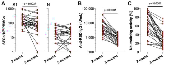 In the previous study, the SARS-CoV-2 specific T cell and antibody levels of previously infected HCWs were assessed two weeks after the completion of the primary vaccination series (i.e., one or two vaccinations depending on vaccine brand) in June 2021 [9]. In order to investigate the waning of immune responses in the following five months, we assessed the changes in these levels in 32 of 35 HCWs five months post-vaccination in November 2021. Compared to two weeks after vaccination, the S1-specific T cell responses were significantly lower at five months post-vaccination (p = 0.0037) (Figure 2A). In more detail, the median S1-specific T cells decreased from 126 (IQR 89–228) to 74 (IQR 46–132) spot-forming cells (SFCs) per 106 PBMCs. In contrast, N-specific T cell responses remained comparable between the two time points, with a median of 16 (IQR 8–32) and 18 (IQR 4–36) N-specific SFCs per 106 PBMCs, respectively. Moreover, we observed significantly lower anti-RBD IgG serum concentrations and the lower neutralizing activity of these antibodies (both p < 0.0001) five months post-vaccination (Figure 2B,C). Median anti-RBD IgG concentrations significantly decreased from 3415 (IQR 2071–6631) to 907.5 (IQR 449.5–1400) IU/mL and the median neutralizing activity of antibodies decreased from 67.4% (IQR 47.1–90.3%) to 28.8% (IQR 16.1–40.0%) (both p < 0.0001).