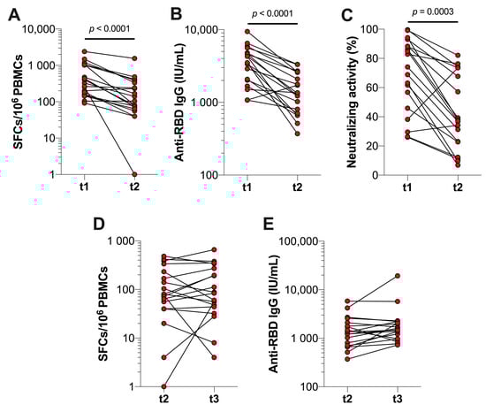 To determine the durability of T cell and antibody responses induced by booster vaccination, we assessed SARS-CoV-2-specific T cell and antibody responses four and seven months after booster vaccination in previously infected HCWs. We observed that the S1-specific T cell response was significantly decreased (p < 0.0001) four months post-booster vaccination from a median of 328 (IQR 160–1036) to 104 (IQR 64–336) SFCs per 106 PBMCs (Figure 4A). Similarly, the anti-RBD IgG concentrations and neutralizing activity decreased (p < 0.0001 and p < 0.0003, respectively) from a median of 3510 (IQR 2023–4788) to 1332 (IQR 705.8–2581) IU/mL and from 74.1% (IQR 45.9–88.3%) to 37.1% (IQR 22.8–73.5%), respectively (Figure 4B,C). In contrast to the first four months after booster vaccination, we observed that the number of S1-specific T cells and anti-RBD IgG concentrations remained similar after the subsequent three months (i.e., t3) (Figure 4D,E). Moreover, the anti-RBD IgG concentrations at four and seven months after booster vaccination were significantly higher compared to the concentration at five months after the primary vaccination series (p = 0.0202 and p = 0.0003, respectively). However, S1-specific T cell responses were not significantly different between these time points.