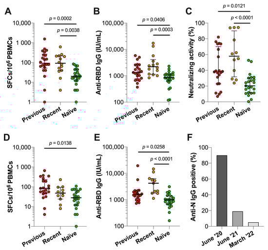 3.4. Comparison of Immune Responses between Previously Infected, Recently Infected and Infection-Naïve Individuals