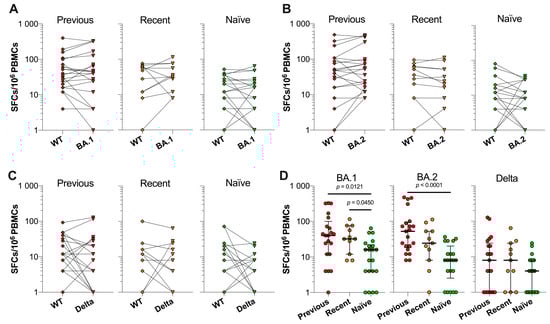 Furthermore, there were significantly higher Omicron BA.1 spike-specific T cell responses in previously and recently infected HCWs than in infection-naïve HCWs (p = 0.0121 and p = 0.0450, respectively) (Figure 6D). Omicron BA.2 spike-specific T cell responses were significantly higher in previously infected HCWs compared to infection-naïve HCWs (p = 0.0001). In contrast, no significant differences were observed in Delta spike-specific T cell responses between the HCW groups. Median SFCs per 106 PBMCs for previously infected, recently infected, and infection-naïve HCWs were 40 (IQR 12–100), 32 (IQR 12–76), and 16 (IQR 4–22) after Omicron BA.1 spike peptide pool stimulation, 52 (IQR 18–94), 24 (IQR 8–52), and 8 (IQR 2–20) after Omicron BA.2 spike peptide pool stimulation and 8 (IQR 0–24), 8 (IQR 0–24), and 4 (IQR 0–8) after Delta spike peptide pool stimulation, respectively.