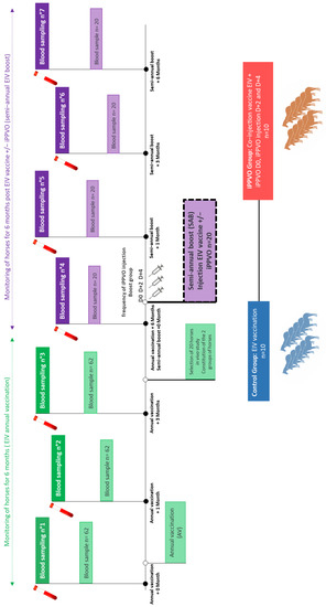 All blood samples (screening and study phases) were taken from the jugular vein (1 dry tube of 10 mL per horse). During the study phase and for both groups, one blood sample was taken immediately prior to boost EI immunisation. Other blood samples were collected 1, 3 and 6 months after the semi-annual boost (SAB) vaccination. All of the samples were stored for a maximum of 4 h at +4 °C before the serum was collected. The collected sera were stored at −20 °C.