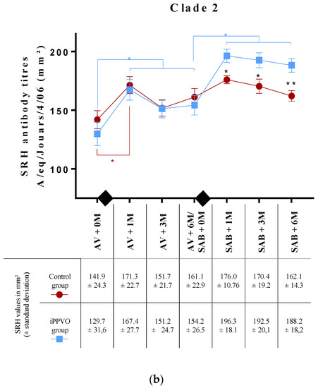 Mean H3N8 single radial haemolysis (SRH) antibody response measured before and after booster vaccination. The values correspond to sera isolated from blood samples that were collected in the control and iPPVO groups before the annual vaccination (AV), 1 and 3 months after the AV and before the semi-annual boost (SAB), and 1, 3 months and 6 months after the SAB. The red circles correspond to the mean SRH values in the control group (n = 10), and the blue squares correspond to the mean SRH values in the iPPVO group (n = 10) for (a) A/equine/Paris/1/2018 strain clade 1 strain and (b) A/equine/Jouars/4/06 EIV clade 2 strain. The diamonds represent the time of the AV injection and the 6 months SAB injections with or without iPPVO. Error bars represent standard error of the mean. Black stars correspond to a significant increase in the haemolysis area for the iPPVO group compared to the control group (two-factor ANOVA test; * and ** for p < 0.05 and p < 0.005, respectively). A red star represents the significant increase in the haemolysis area for the control group over time, and the blue stars represent the significant increase in the haemolysis area for the iPPVO group over time.