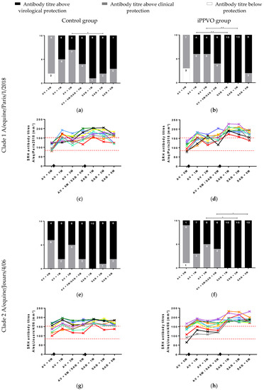 Individual results concerning the A/equine/Jouars/4/06 strain are presented in Figure 3e–h. Before AV, six horses were above the clinical protection threshold, and four were above the virological protection threshold in the control group (Figure 3e,g). In the iPPVO group (Figure 3f,h) only one horse was below the clinical protection threshold, eight horses were above the clinical protection threshold, and only one was above the virological protection threshold. After AV and before the SAB immunisation, no horse was below the clinical protection threshold in either group, and the number of horses above the virological protection threshold varied between five and eight in the control group and between five and seven in the iPPVO group (Figure 3e,g). After the SAB immunisation, no horse was below the clinical protection threshold in either group. In the control group, the number of horses above the virological protection threshold decreased from ten to eight at the end of the study (Figure 3e,g). In the iPPVO group, all horses were above the virological protection threshold (Figure 3f,h). As above, when looking at the frequency of horses that reached the criteria for clinical or virological protection, no significant difference was observed between the two groups. However, for three time points (SAB + 1M, +3M and +6M), all horses in the iPPVO group were above the virological threshold. From an association point of view, there was no significant difference in the frequency of horses based on the protection threshold for the control group (Figure 3e). In contrast, there were significant differences in the iPPVO group between the AV + 3M and SAB + 3M (p-value = 0.010) and AV + 6M and SAB + 6M time points (p-value = 0.025) (Figure 3f). These results show that significantly more horses passed the virological protection threshold at 3 and 6 months after a semi-annual boost than at 3 and 6 months post annual booster.