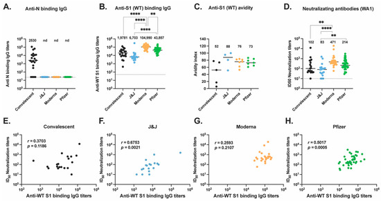 Antibody responses to ancestral SARS-CoV-2 elicited by vaccination or natural infection. (A) Anti-N IgG antibody titers (B) Anti-S1 IgG antibody titers were assessed for convalescent (black, n = 21), J&J (blue, n = 20), Moderna (orange, n = 28), and Pfizer (green, n = 47) participants. (C) Anti-S1 (WT) IgG antibody avidity assessed using urea wash ELISA. Data expressed as a ratio of urea-washed absorbance to unwashed absorbance for convalescent (black, n = 5), J&J (blue, n = 4), Moderna (orange, n = 7), and Pfizer (green, n = 7) participants. (D) Neutralizing antibody titers are shown as log10 of half-maximal inhibitory dilution (ID50) for convalescent (black, n = 19), J&J (blue, n = 18), Moderna (orange, n = 25), and Pfizer (green, n = 43) participants. For plots A to C, ** p < 0.01, and **** p < 0.0001 by Kruskal–Wallis test. Dotted line shows limit of detection of the assays. Median is shown by black horizontal bar and values above each group, with data below the limit of detection, marked nd for non-detected. (E–H) Correlations between neutralizing antibody titers (ID50) and binding antibody titers for the (E) convalescent, (F) J&J, (G) Moderna, and (H) Pfizer groups. Spearman’s r and p values are shown.