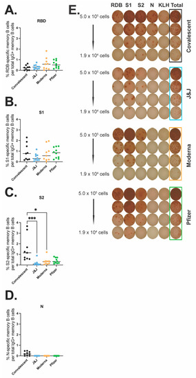 ELISpot assays were used to detect antigen-specific IgG memory B cells using cryopreserved PBMCs. PBMCs were rapidly thawed in a 37 °C water bath and slowly added to 10 mL of warmed RPMI-1640 containing 10% fetal calf serum (FCS), 100 units/mL of penicillin G, and 100 μg/mL of streptomycin (Gibco, New York, NY, USA), referred to as R10, with 1:5000 dilution of recombinant DNase I (Roche, Basel, Switzerland, 04716728001). The cells were then counted using Countess and resuspended as 1.0 × 106 cells/mL in stimulation media (R10 with 1:5000 dilution of DNase I and 1:2000 dilution of B-Poly-S (CTL-BPOLYS-200, ImmunoSpot) and 1 μL of 1 mM 2-Mercaptoethanol (Sigma, M3148) per mL of R10). A total of 1.0 × 106 cells in 1 mL were then added to each well of a 24-well plate (Corning, Somerville, MA, USA, 3527) and incubated at 37 °C with 5% CO2 for 5 days. At least 18 h prior to day 6, sterile Millipore multiscreen-HA 96-well plates with an MCE membrane (Millipore, Burlington, MA, USA, MSHAN4B50) were coated with 2 μg/mL of target recombinant antigens—S1, S2, RBD, or N (Sino Biological Inc., Chesterbrook, PA, USA, 40591-V08H, 40590-V08B, 40592-V08H, and 40588-V08B), 10 μg/mL of donkey anti-human IgG capture antibody (Jackson ImmunoResearch Laboratory Inc., West Grove, PA, USA, 709-005-149), or 2.5 μg/mL of negative control Imject Mariculture keyhole limpet hemocyanin (KLH) (Thermo Fisher Scientific, Waltham, MA, USA, 77600). Coated plates were then incubated at 4 °C. On day 6, coated plates were washed four times with 200 μL of PBS-T and blocked for 2 h at 37 °C with 200 μL R10. Stimulated cultures from the 24-well plate were transferred into 5 mL sterile conical tubes and resuspended in R10 at 1.0 × 106 cells/100 μL. A total of 50 μL of cells in R10 at 1.0 × 106 cells/100 μL were added to the top row of specific antigen detection wells containing 150 μL R10 and 5 μL of cells to the first dilution wells for total IgG detection wells containing 195 μL R10. A 3-fold serial dilution was then performed three times. Total IgG detection wells were diluted 10-fold higher than the target antigen wells to facilitate spot-counting. Plates were incubated for 6 h at 37 °C with 5% CO2. Plates were then washed three times with 200 μL PBS followed by four times with 200 μL PBS-T. Biotinylated goat anti-human IgG (Jackson ImmunoResearch Laboratory Inc., West Grove, PA, USA, 709-065-098) was diluted 1:1000 in PBS-T with 2% FCS (Ab diluent) and 100 μL was added to the wells for overnight incubation at 4 °C. Plates were washed four times with 200 μL of PBS-T and incubated with 100 μL of Avidin-D-HRP conjugate (Vector Laboratories, Newark, CA, USA, A-2004) diluted 1:1000 in PBS-T with 2% FCS for 1 h at RT. Plates were washed four times with 200 μL PBS-T and three times with PBS. 100 μL of AEC substrate (3 amino-9 ethyl-carbazole; Sigma Aldrich, St. Louis, MO, USA, A-5754) was added. Plates were incubated at room temperature for 5 min and rinsed with water to stop the reaction. Developed plates were scanned and analyzed using an ImmunoSpot automated ELISpot counter (Cellular Technology Limited, Shaker Heights, OH, USA) or Cytation 7 (BioTek, Venusky, VT, USA).