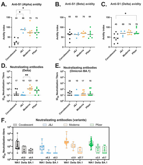 Next, we characterized the antibody response against SARS-CoV-2 variants of concern (VOC), including alpha, beta, delta, and omicron BA.1, across our four groups. We first measured avidity for the alpha S1 (Figure 4A), beta S1 (Figure 4B), and delta S1 (Figure 4C). The vaccinated groups showed higher avidity for the alpha S1 than the convalescent participants. The Moderna and Pfizer groups also showed higher avidity for the delta S1 as compared to the convalescent group, with a significant difference between the convalescent and the Pfizer group (p = 0.479). These differences suggest broader drift-variant coverage with the mRNA vaccines relative to variant coverage after natural infection.