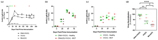 Anti-OvHV-2 gB antibody response in plasma of animals immunized with OvHV-2 DNA plus AlHV-1-vectored vaccine [DNA+VV(IV)], AlHV-1-vectored vaccine only [VV(IV)], or mock control [Mock(IV)] and challenged with OvHV-2 at 49 days post-prime immunization in Experiment 1. (a) Anti-OvHV-2 gB antibody responses pre- and post-immunizations and challenge measured by ELISA; error bars represent SEM and arrows represent immunizations (green) and challenges (red) times. (b,c) Individual anti-OvHV-2 gB antibody response in animals that remained healthy or developed SA-MCF following OvHV-2 challenge in the DNA+VV(IV) (b) and VV(IV) (c) groups; bars indicate the median. (d) Individual anti-OvHV-2 gB neutralizing antibody response measured by viral neutralization assay in each group at 46 days post-prime immunization; green symbols refer to animals that remained healthy after challenge and red symbols to animals that developed MCF; bars indicate mean; **** p ≤ 0.0001, ** p = 0.0022, and * p = 0.