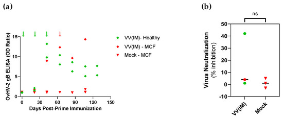 Anti-OvHV-2 antibody response in plasma of animals that developed MCF or were protected from disease following immunization with the AlHV-1-vectored vaccine delivered by intramuscular injection [VV(IM)] or a mock control and challenge with OvHV-2 in Experiment 2. (a) Individual OD ratio in plasma diluted at 1:400, as detected by ELISA. (b) Neutralizing antibody response at challenge time (64 days post-prime immunization), as measured by viral neutralization assay. Arrows represent immunizations (green) and challenge (red) times. ns, not statistically significant.