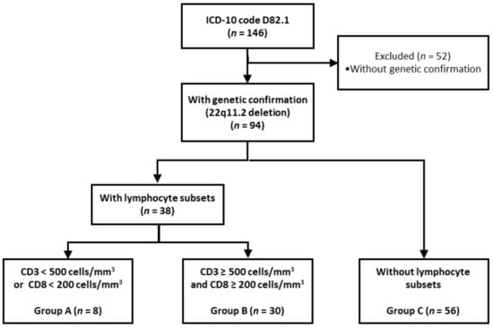 DiGeorge syndrome (DGS), also known as 22q11.2 deletion syndrome, is the most common microdeletion syndrome, with a prevalence of 1 in 4000 live births [1]. It is characterized by a wide range of clinical features, including congenital heart disease, hypoparathyroidism, facial dysmorphism, developmental delay, and immunodeficiency [1,2,3]. Patients with DGS show varying levels of T cell deficiencies (ranging from an absence of T cells to normal counts) and percentages due to thymic hypoplasia [4]. A very low T cell count (CD3 < 50 cells/mm3 or < 1–2%) is often regarded as complete DGS, whereas patients with partial DGS (pDGS) contain relatively higher T cell counts with a wide range of lymphoproliferative functions [5,6].