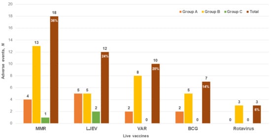 In group A, 13 AEFLI (LJEV, 5; MMR, 4; VAR, 2; BCG, 2) occurred after 29 live vaccine doses and in group B, 34 AEFLI (MMR, 13; VAR, 8; BCG, 5; LJEV, 5; rotavirus, 3) occurred after 112 live vaccine doses. No significant difference was observed in the incidence of AEs between groups A and B (45% vs. 30%, p = 0.14) (Table 3).