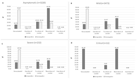 When the levels of antibodies were compared with regard to the clinical form of their last (most recent) COVID-19 episode and their vaccination status, the highest seroprevalence of SARS-CoV-2 antibodies was observed in participants with asymptomatic (64.36%), mild (45.17%), severe (38.39%), and critical (45.45%) forms who received three doses of the COVID-19 vaccines, as well as in unvaccinated participants who had and recovered from the critical form of COVID-19 (45.45%). On the other hand, with the exception of the critical form of COVID-19 (there were no seronegative samples to SARS-CoV-2 in this group), the highest seronegativity to SARS-CoV-2 was noticed among the unvaccinated participants regardless of the clinical form of COVID-19 they had (asymptomatic, 59.87%; mild, 83.85%; and severe, 87.50%) (Figure 3 A-D).