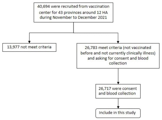 People were sampled after the 4th pandemic wave in Thailand. Apparently, this was performed rather proportionally across the 13 health–administrative Thai regions. Subjects were enrolled based on voluntary participation at vaccination points: 40,694 people coming in were informed to participate in the project; in addition, requests for personnel data and blood donations were put forward if they met the basic criterion of not being vaccinated up to the point of participation, and not being clinically ill to the best of their knowledge with COVID-19. The summary for the sampling plane is show in Figure 1.